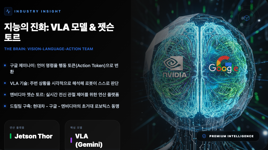 아틀라스가 특별한 이유는 그 '뇌'에 있습니다. 현대차는 구글 딥마인드, 엔비디아와 손을 잡고 '휴머노이드 드림팀'을 구축하여 지능의 차원을 높였습니다.